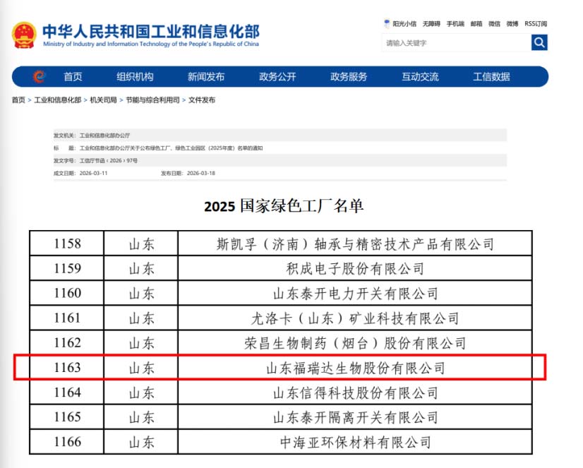 近日,工业和信息化部正式公布2025年度国家级绿色工厂名单,山东福瑞达生物股份有限公司凭借在绿色智造、节能减排及可持续发展领域的深耕细作与卓越实践,成功跻身国家级绿色工厂行列,成为化妆品行业践行“双碳”战略、推动产业绿色转型的标杆企业。