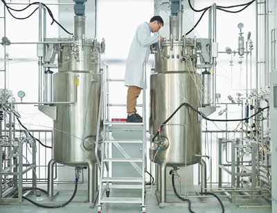 研发车间内,技术员摇动试管,葡萄糖原料上下晃动。发酵实验室里,多个发酵罐依次排列,分别连接着密密麻麻的管子。罐内,经过改造的工程菌正以葡萄糖为原料进行“辛勤劳作”。