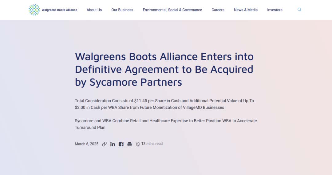 近日,美国私募股权公司梧桐投资(Sycamore Partners)宣布完成对全球最大“药+妆”集团沃尔格林联合博姿(WBA)的收购,交易总价值约1693.2亿元人民币。据悉,此次收购从2024年底启动谈判,2025年3月敲定每股11.45美元现金收购方案,7