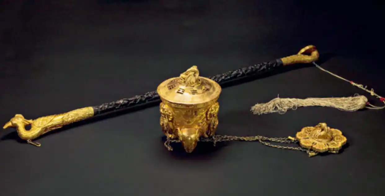 一对对凤翣龙旌,雉羽宫扇;又有销金提炉,焚着御香。……又有执事太监捧着香巾、绣帕、漱盂、拂尘等物。