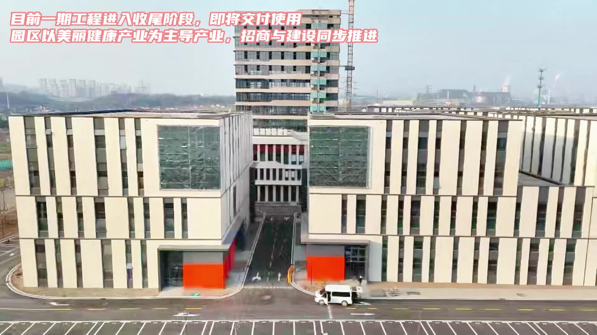 这里是“南京美谷”美丽健康产业园,建设已基本完成,正在外立面收尾、绿化种植和设备进场的最后阶段。