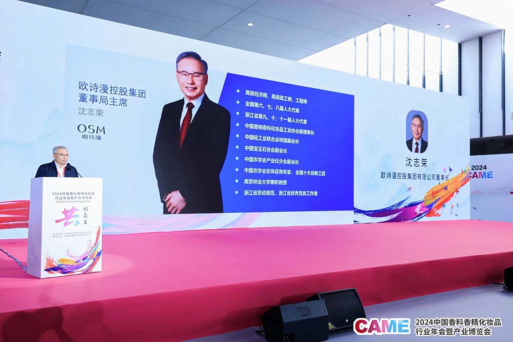 10月18日上午,2024中国香料香精化妆品行业年会暨产业博览会(以下简称:2024CAME)开幕式在南京开幕。南京人民政府市长陈之常,中国香料香精化妆品工业协会理事长颜江瑛,中国工程院院士陈卫,省药品监督管理局局长田丰,市领导陆卫东、蒋敏、中国妇女发展基金会理事长杜芮等出席。国内外企业家、行业专家和知名学者等嘉宾领导与会。开幕式由绿叶集团、创始人董事长徐建成主持。