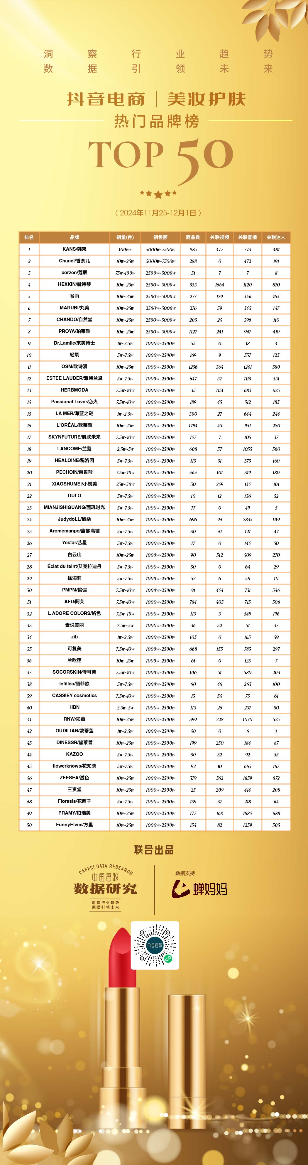 2024年11月25-12月1日|抖音电商美妆护肤热门品牌榜TOP50