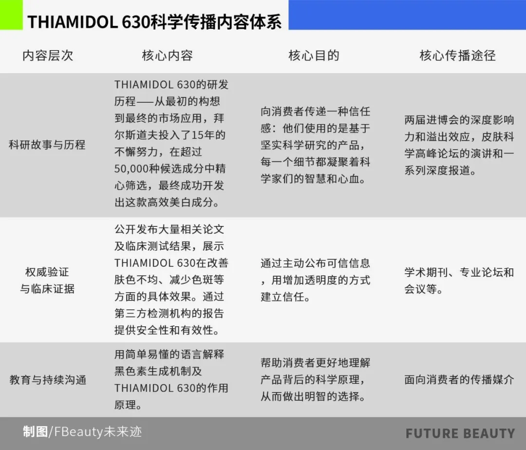 据拜尔斯道夫中国企业事务总经理雷开霆透露,拜尔斯道夫先是围绕Thiamidol 630从“科研故事”“权威验证和临床数据”“教育和持续沟通”三个方面,构建了多层次全方位的内容体系。