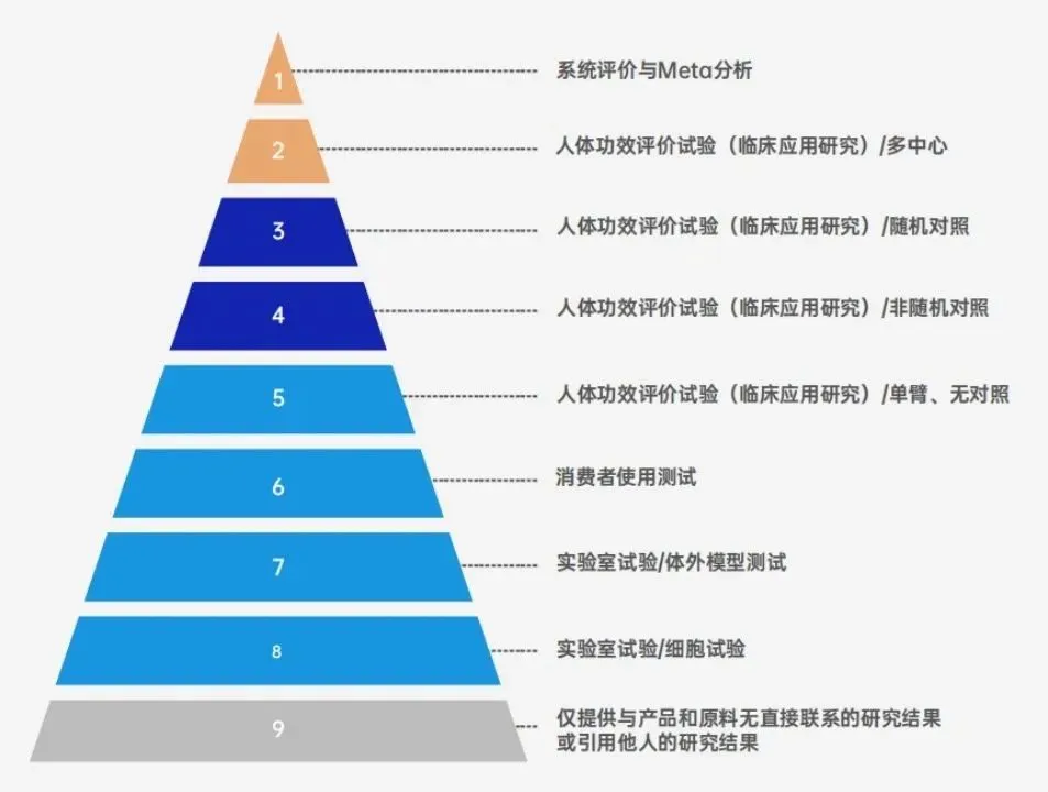 在这套评价体系中,从最初级的“仅提供与产品和原料无直接联系的研究成果或引用他人的研究结果”到最高级的“系统评价与Meta分析”共分为9级,越高级别的内容可信度越高,能给品牌带来的势能也就越大。
