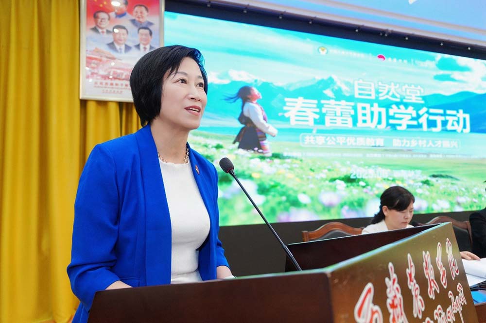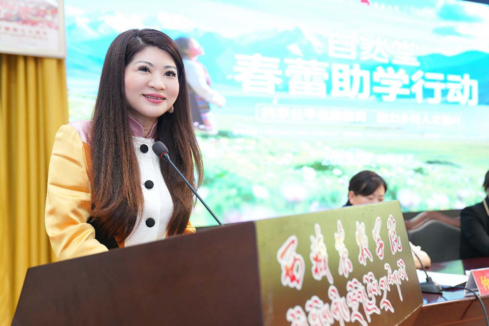 潘铭副主席表示“自然堂春蕾助学行动”在西藏地区落地,已成为助力全区困难家庭女童逐梦求学的坚实桥梁,是一项体现着党政关怀、社会关爱的民生工程。她希望同学们坚定理想信念,脚踏实地,传递爱心,勇做时代的弄潮儿,将个人成长融入国家发展大局,在实现中华民族伟大复兴的征程中找准人生坐标,在实现中国梦的生动实践中放飞青春梦想。