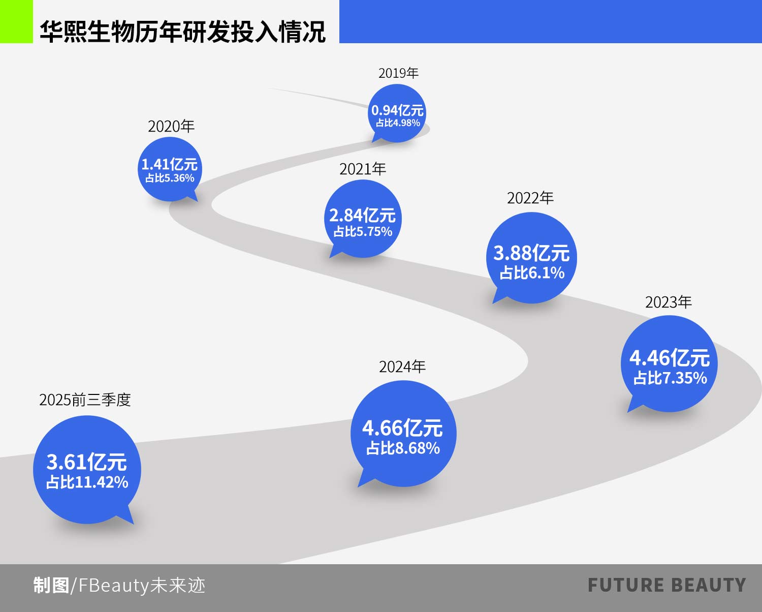 与许多企业在行业承压时选择收缩不同,华熙生物在过去几年里始终保持着对研发的稳定投入节奏。自2019年科创板上市至2025年上半年,公司累计研发投入已超过22亿元。在健康消费品领域,这一投入规模长期处于行业前列,且连续多年维持高位。
