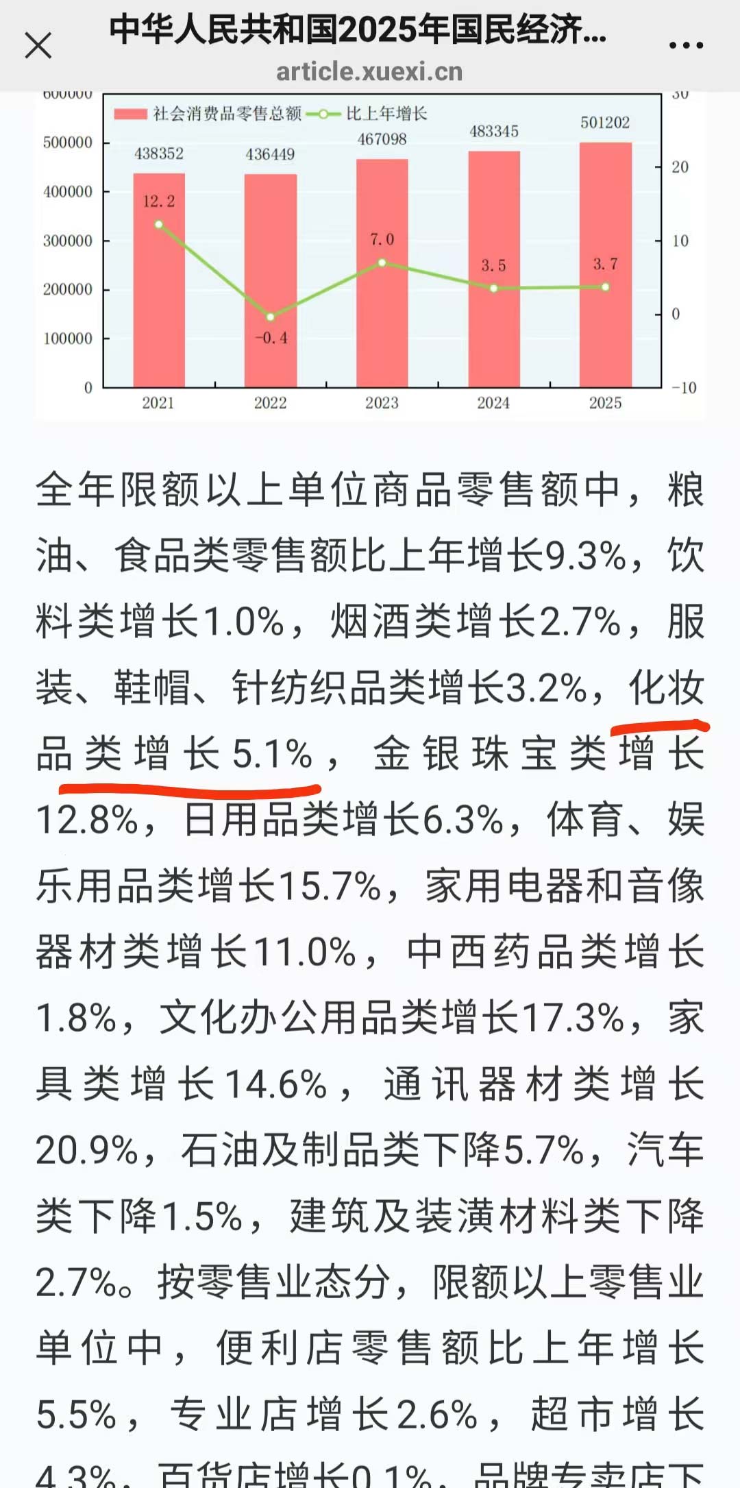 2月28日,国家统计局发布《中华人民共和国2025年国民经济和社会发展统计公报》。数据显示,2025年全年社会消费品零售总额501202亿元,比上年增长3.7%。在限额以上单位商品零售类别中,化妆品类以5.1%的同比增速脱颖而出,跑赢了大盘,高于GDP增速0.1个百分点 。