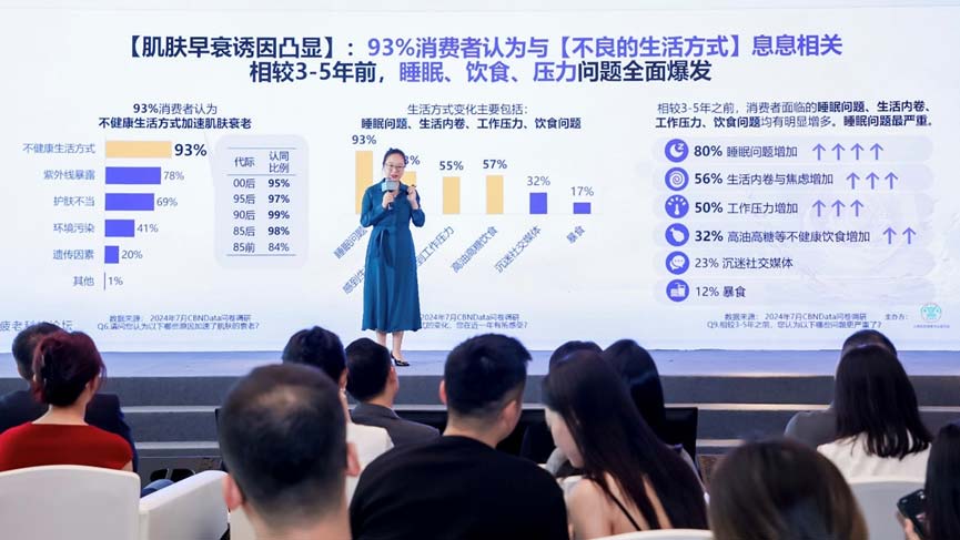 中国女性“皮肤衰老年轻化”趋势究竟是如何产生的?会议上,上海应帆数字科技有限公司(CBNData)副总裁姚贝贝的另一份消费者大数据调研揭开了趋势背后的深层原因。数据显示,如今年轻人的睡眠、饮食、工作、习惯等生活方式和行为均出现了重大变化:在日常工作和生活压力下,年轻人平均睡眠时间缩短了1.25个小时,六成95、90后的工作时长增加超1小时。此外调研还发现,越年轻越受高油高糖困扰,而这与衰老年轻化趋势高相关。多项数据指向一个结论:疲惫,是导致衰老越来越年轻化的重要原因之一。