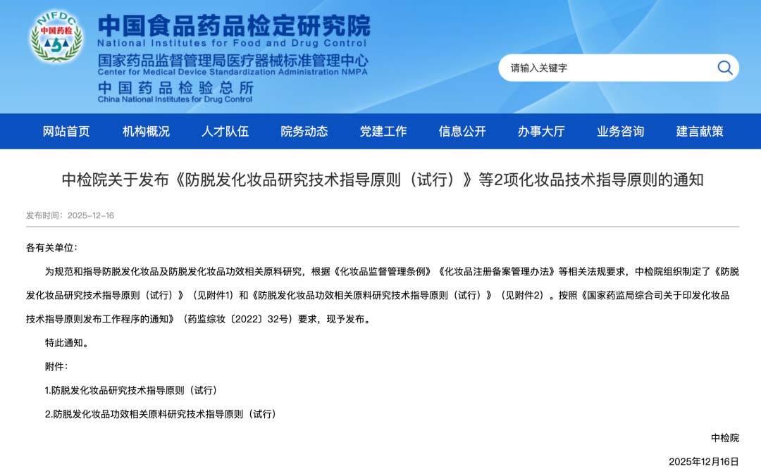 12月16日,中国食品药品检定研究院发布《防脱发化妆品研究技术指导原则(试行)》《防脱发化妆品功效相关原料研究技术指导原则(试行)》,规范和指导相关研究。按照其内容,防脱发功效相关原料细分为防脱发剂和防脱发辅助剂两类,填报为防脱发辅助剂的,不得在产品标签中宣称防脱发辅助剂的防脱相关功效。