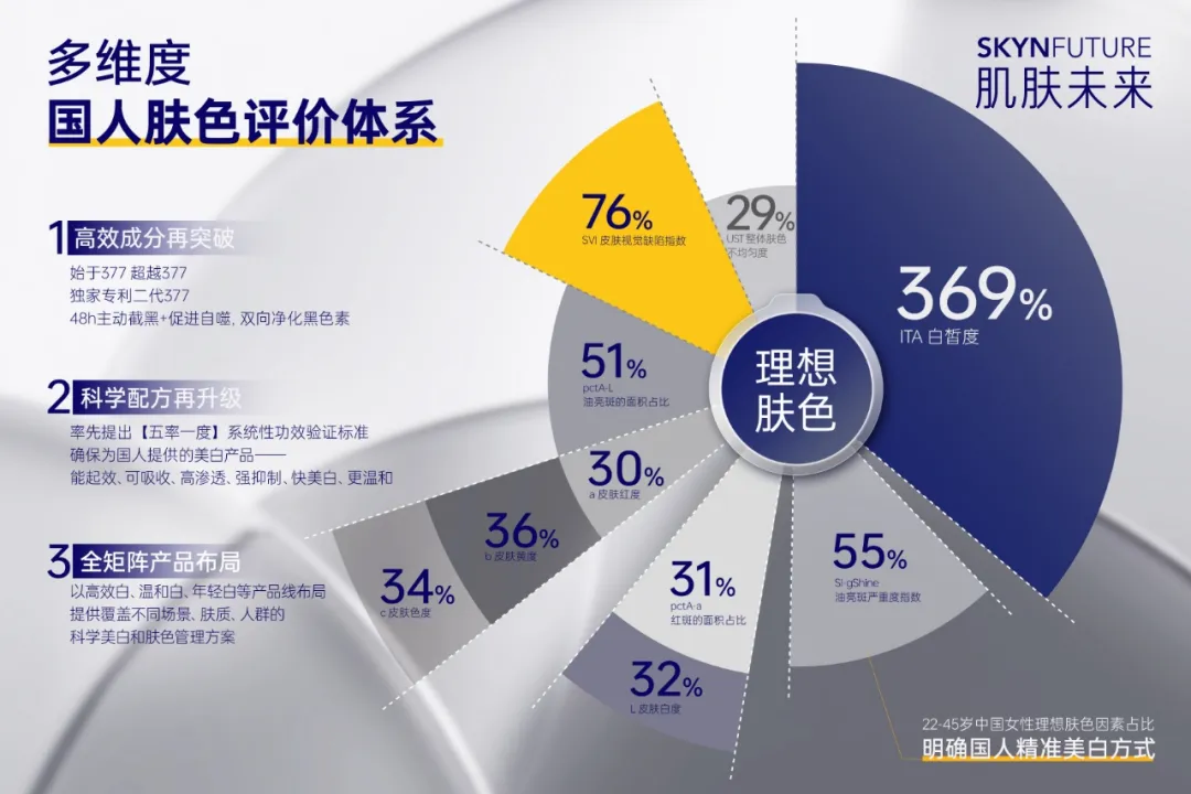而肌肤未来发布的「377科学美白标准」恰恰是一套从基础研究到应用开发的完整技术体系,为美白行业提供了全新的解决方案。