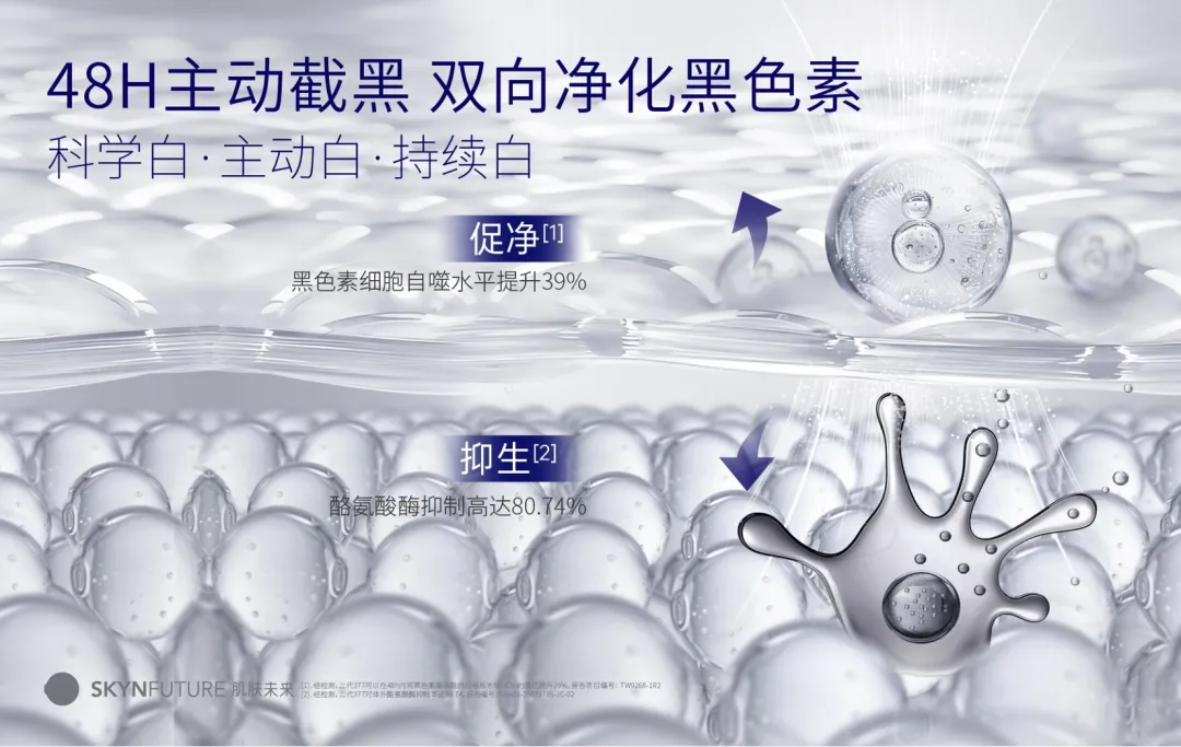 从品牌创立之初,肌肤未来便专注于科学美白的探索,联合377成分的发明方——全球知名原料供应商德之馨,共同研发更适合国人肤质的377。以377为核心,利用配方技术强化功效成分的渗透性,从1.0 美白功效成分研究阶段,到2.0 美白功效组合应用阶段,再到3.0时代的“多路径、高协同、强递送”在多剂型全品类的科技应用,与无数用户共同见证了377强大的美白功效。