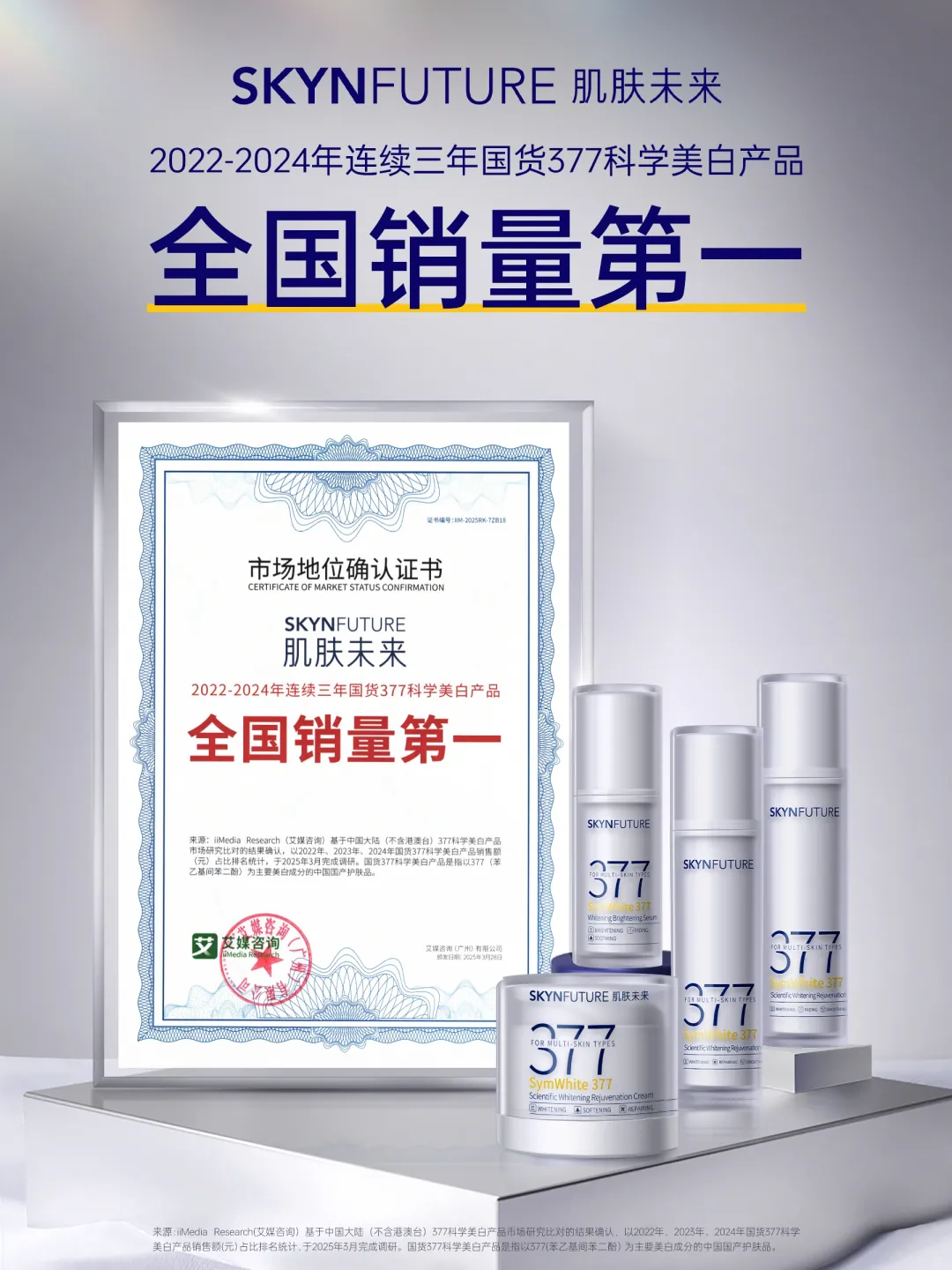 [7]来源:iiMedia Research(艾媒咨询)基于中国大陆(不含港澳台)377科学美白产品市场研究比对的结果确认,以2022年、2023年、2024年国货377科学美白产品销售额(元)占比排名统计,于2025年3月完成调研。国货377科学美白产品是指以377(苯乙基间苯二酚) 为主要美白成分的中国国产护肤品。
