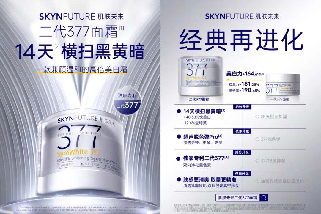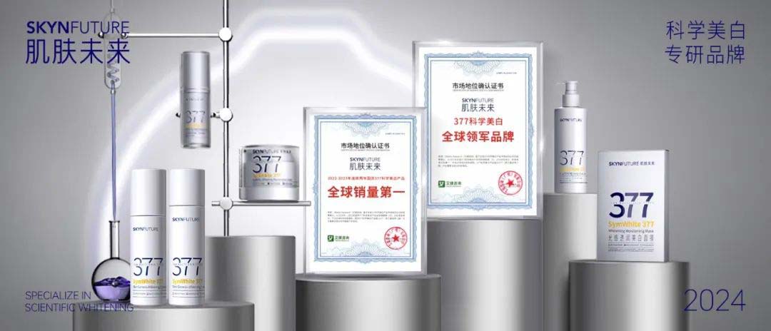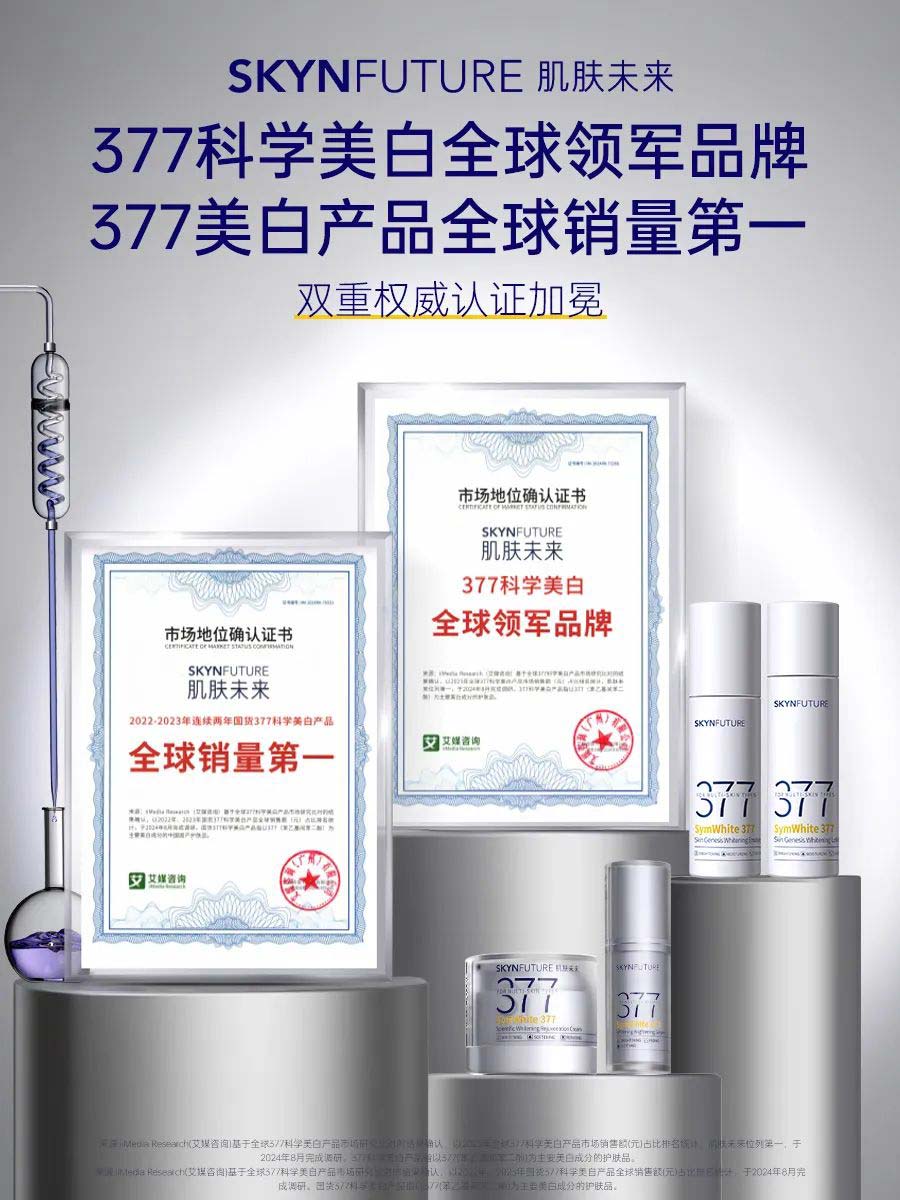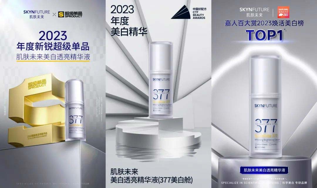 2023年,肌肤未来377美白舱精华重磅升级上市。产品搭载肌肤未来独家专利二代377成分,在高浓度377添加的基础上配方全新升级;独特的双重舒缓体系,为肌肤降低了猛药耐受门槛,让美白过程更加温和、低刺激;无油配方体系,解决高浓度377应用难点,质地清爽肤感优异,保证皮肤有效吸收美白。新品377美白舱上市七天,销售额即突破1000万+,累计售出60000支+,再创377科学美白新纪录。这颗美白界新星诞生即闪耀,上新即爆品,拿奖拿到手软:被广告门评为「2023新锐超级单品」;2023中国好配方“年度美白精华”;被时尚杂志嘉人评为嘉人百大赏“焕活美白榜TOP1”。