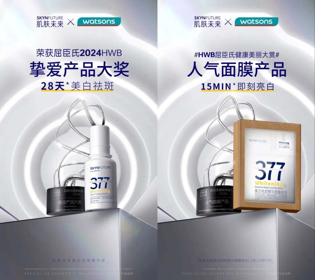 肌肤未来在创立之初的定位就是实验室品牌,它天生就带着无限探索、尝试不断打破自我认知、不断进化的品牌印记,当肌肤未来认准「科学美白」这条路,便全情All in。 肌肤未来377精华(肌肤未来美白祛斑精华)自2022年上线屈臣氏渠道以来,2年间销售额突破千万元,是当之无愧的“美白C位”,在2024年屈臣氏“健康美丽大赏”中荣获「挚爱产品大奖」;同样身为377家族一员,肌肤未来美白祛斑精华面膜组合一涂二敷,让美白力1+1>2,给用户带去SPA级科学美白护肤体验,位列「人气面膜大奖」,可以说是实至名归。