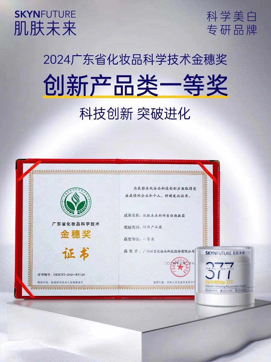 创新力提升产品力,而超强产品力最终会得到市场和行业的双重认可——肌肤未来二代377面霜首发7天便售出超40000瓶,被广东省化妆品科学技术研究会授予「金穗奖创新产品类一等奖」。