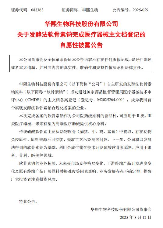 8月12日,华熙生物发布一则重磅消息,公司自主研发的发酵法软骨素钠原料成功通过,国家药品监督管理局医疗器械技术审评中心(CMDE)的主文档备案登记,登记号为M2025264 - 000。这一突破性进展使华熙生物成为我国首个,实现发酵法软骨素钠合规化备案的企业,在医药原料领域迈出了极具意义的一步。