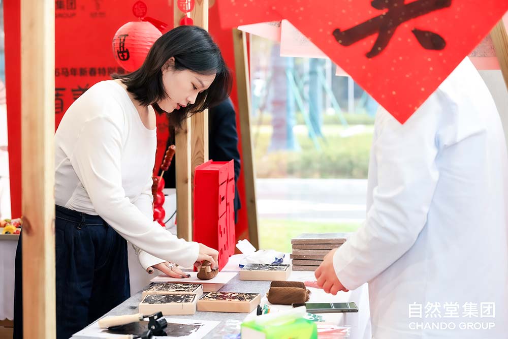 配合展览开幕,自然堂未来美妆城同步打造新春游园会与工厂店年货节,将传统文化、互动体验与消费场景生动融合。游园会现场设有多个创意互动点位,观众可亲手体验甲马版画拓印、书写福字与春联,参与新年彩妆体验、品尝新春特调与糖葫芦,抽取新年福签,并与自然堂IP玩偶合影留念,沉浸式感受浓郁的年节气氛与手作乐趣。