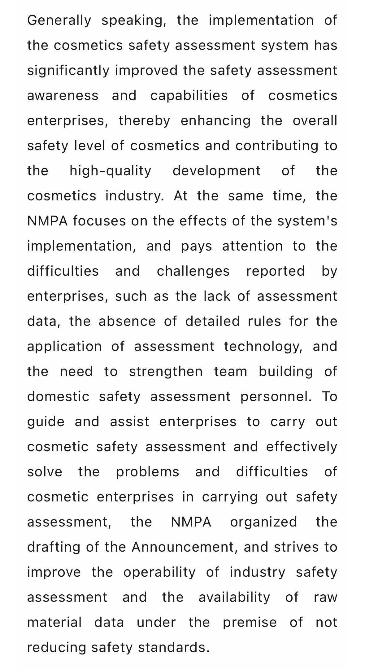 总体来讲,通过施行化妆品安全评估制度,化妆品企业的安全评估意识和能力水平显著提升,我国化妆品安全保障水平普遍提高,有助于化妆品行业高质量发展。同时,国家药监局重点关注安全评估制度实施效果,及时掌握企业反映的困难和挑战,如评估数据缺乏,评估技术的应用缺少细化规则、国内安全评估人员队伍建设有待加强等。为了帮助指导企业开展化妆品安全评估工作,解决企业在开展安全评估时的问题和困难,国家药监局组织起草了本公告,力求在不降低安全标准的前提下,提升行业安全评估的操作性和原料数据的获得性,切实解决化妆品企业在开展安全评估工作存在的问题和困难。