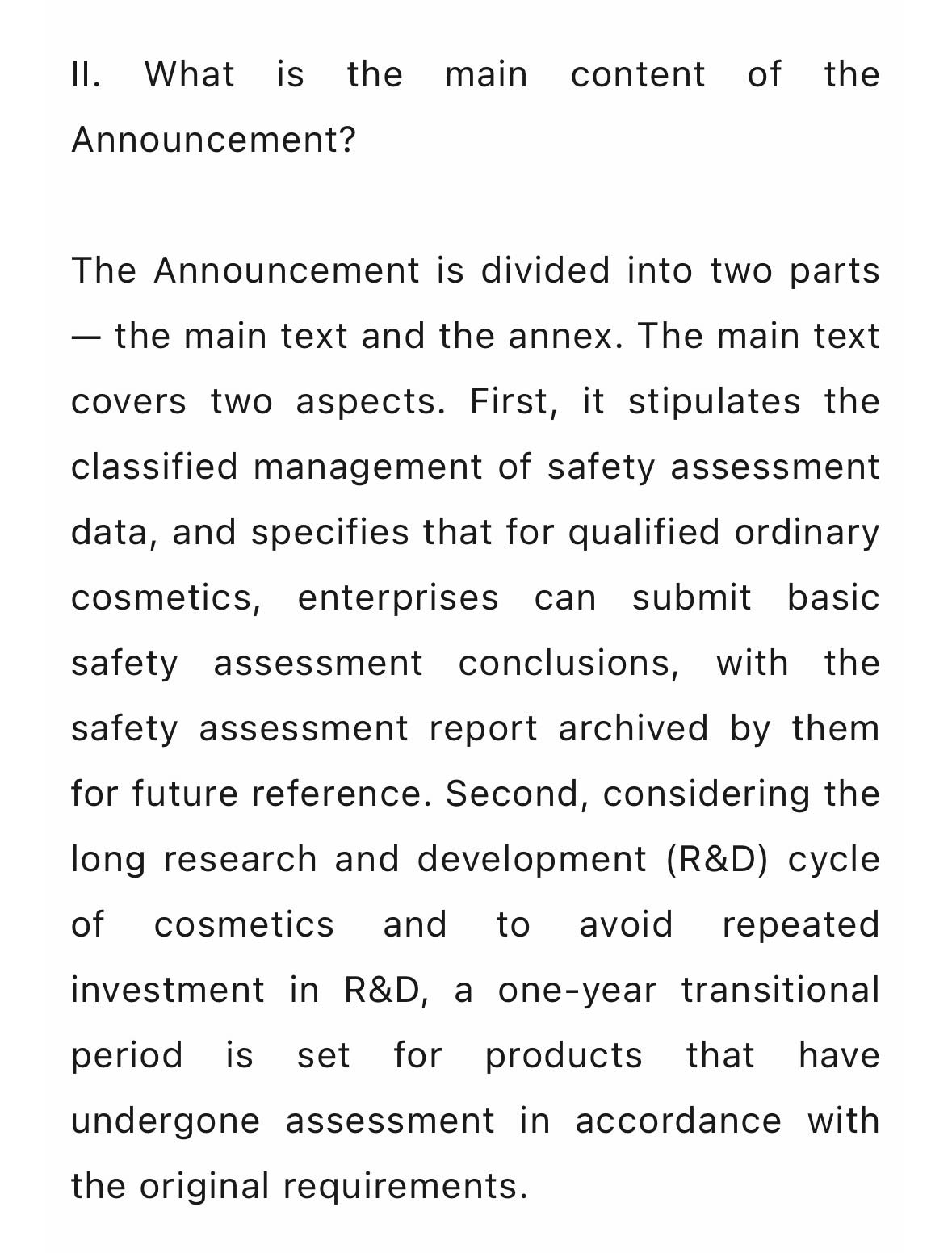《公告》分正文和附件两部分。正文部分主要有两方面内容:一是对安全评估资料实施分类管理,明确对于符合条件的普通化妆品,企业可以提交安全评估基本结论,安全评估报告由企业存档备查。二是考虑化妆品的研发周期较长,为避免研发重复投入,对已按照原有要求开展评估的产品设置了1年的过渡期。