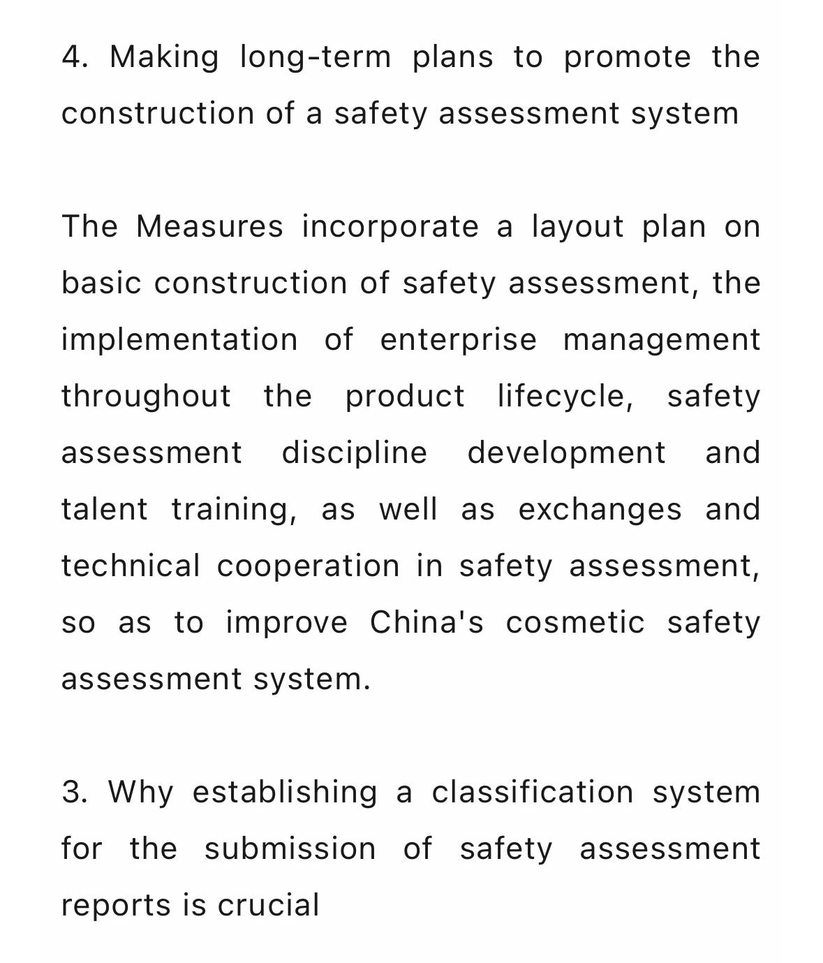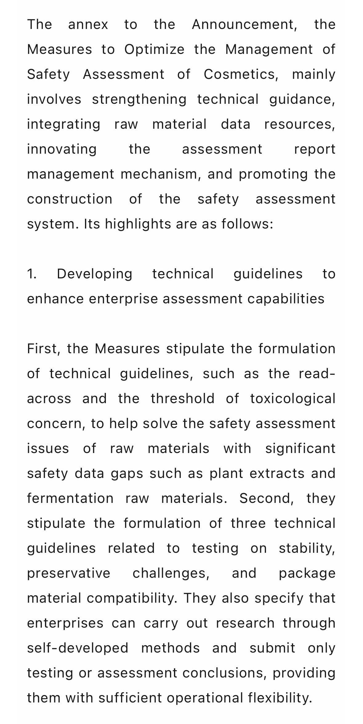 一是制定交叉参照、毒理学关注阈值等技术指南,帮助解决植物提取物、发酵原料等安全数据缺口较大原料的安全评估问题。二是制定稳定性、防腐剂挑战、包材相容性等3个测试相关技术指南,并明确企业可以通过自建方法开展研究,且仅提交测试或者评估结论,给予行业足够的操作空间。