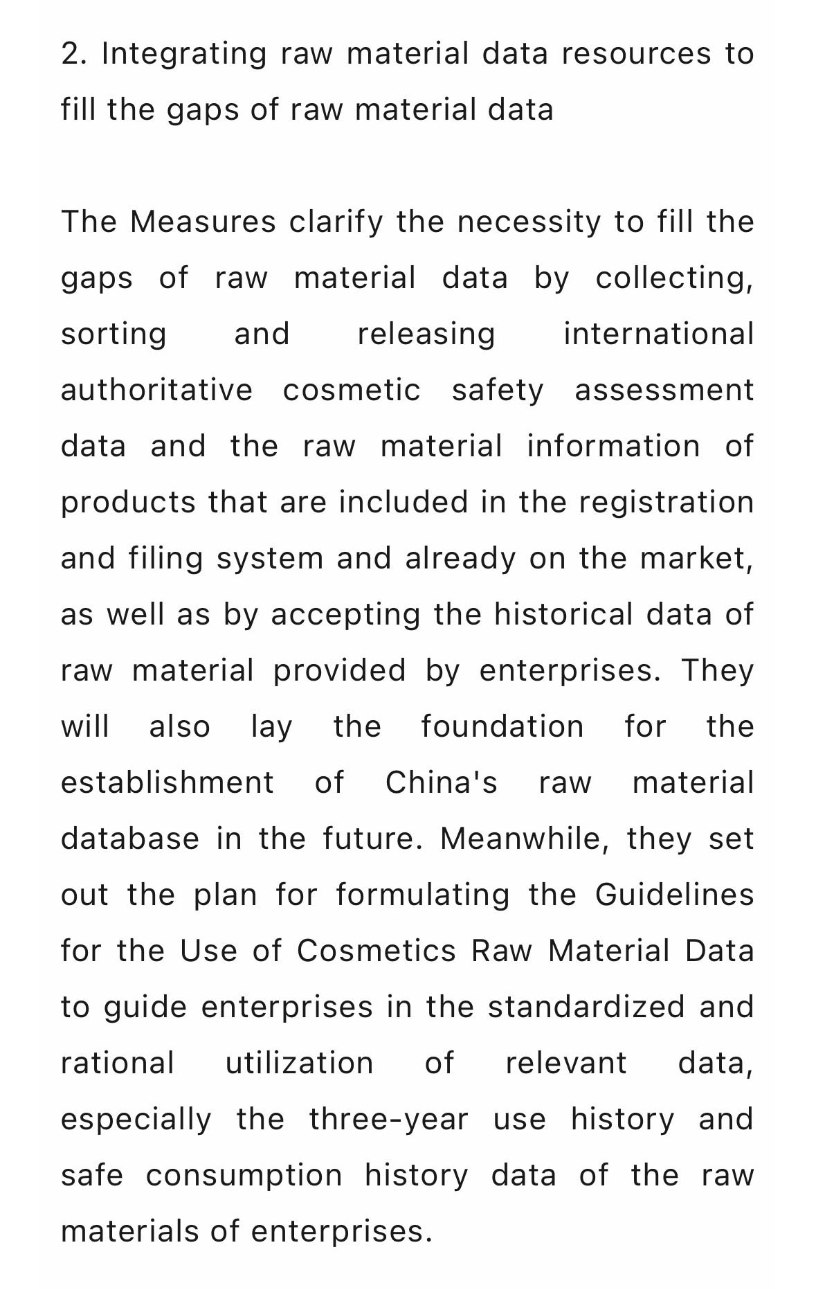 通过收集、整理、发布国际权威化妆品安全评估数据、注册备案系统中已上市产品的原料使用信息,接受企业原料使用历史数据,缓解原料数据缺失的问题,也为将来我国原料数据库的建立打下基础。同时,制定《化妆品原料数据使用指南》,指导企业规范合理使用相关数据,特别是企业原料的3年使用历史和安全食用历史数据。
