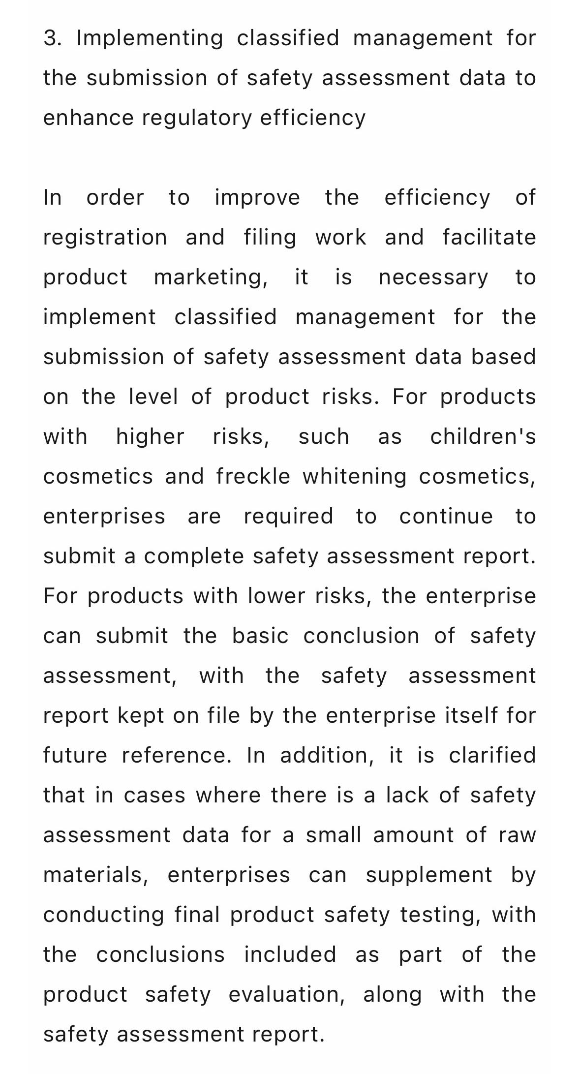 为提升注册备案工作效能,助力产品上市的提质增速,有必要根据产品风险高低对安全评估资料提交实施分类管理。一方面,对于风险较高的产品,如儿童化妆品、祛斑美白类化妆品等产品,要求企业继续提交完整的安全评估报告;另一方面,对于风险较低的产品,企业可提交安全评估基本结论,其安全评估报告由企业留档备查。此外,明确企业在缺少少量原料安全评估数据时,可以补充开展终产品安全性测试,将其结论与安全评估报告一并作为产品安全性的评价依据。