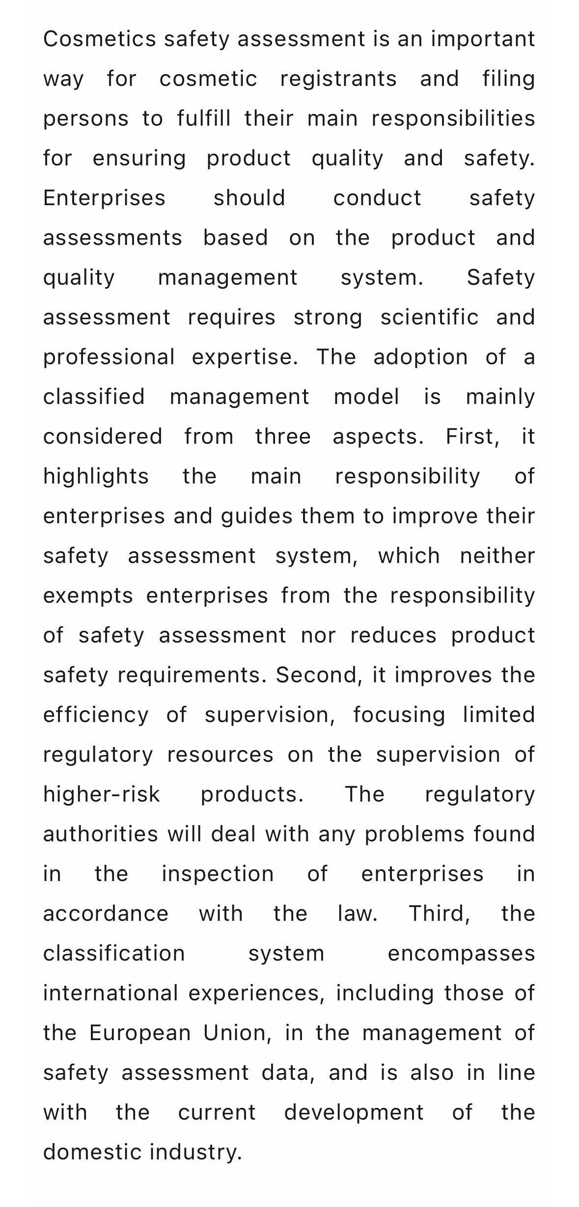 化妆品安全评估是化妆品注册人、备案人落实产品质量安全主体责任的重要途径,企业应当根据产品和质量管理体系情况开展安全评估。安全评估工作具有较强的科学性和专业性。采取分类管理的模式主要考虑三个方面:一是更加突出企业主体责任,引导企业健全安全评估体系,既没有豁免企业安全评估的责任,也没有降低产品安全要求;二是提高监管效能,将有限的监管资源集中于较高风险产品的监管,监管部门对企业开展检查发现问题的,将依法予以处置;三是安全评估报告分类提交参照了欧盟对安全评估资料管理等国际经验,也符合当前国内行业发展实际。