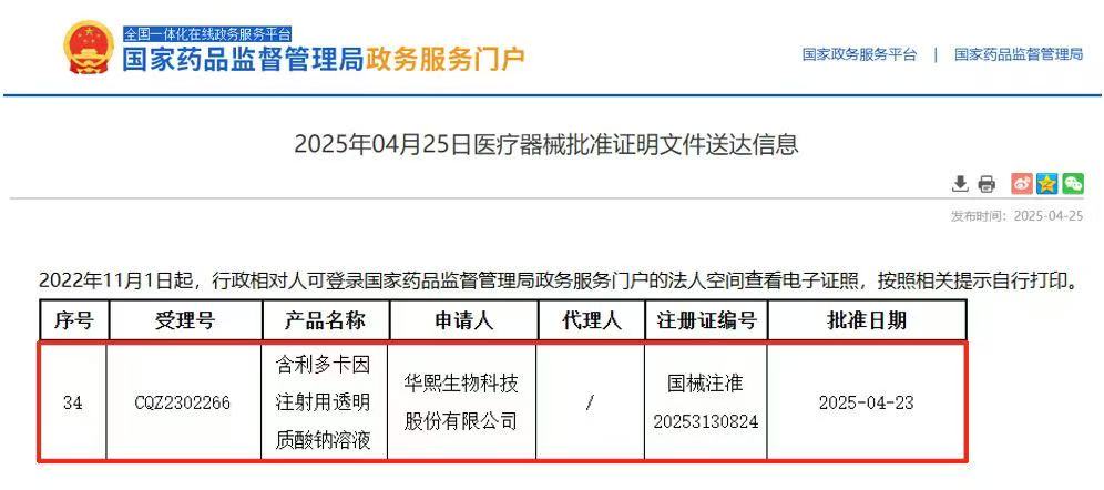 2025年4月25日,华熙生物自主研发的“含利多卡因注射用透明质酸钠溶液(商品名:润百颜·玻玻)”正式获批Ⅲ类医疗器械证,适用于面部真皮浅层注射暂时性改善成人皮肤干燥、肤色暗沉。