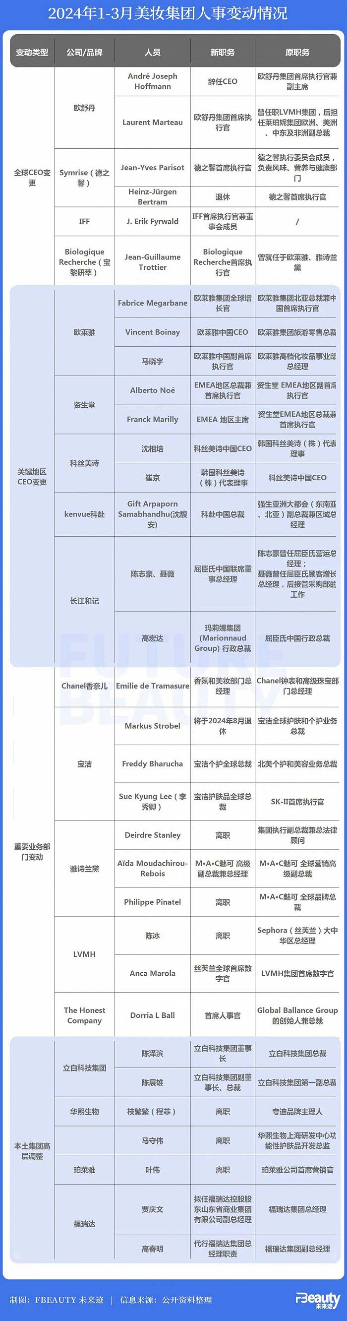 据《FBeauty未来迹》不完全统计,仅在2024的前三个月,全球范围内就有至少18个美妆公司进行了32起人事调动,职位涉及全球一把手换帅、关键业务和地区一把手换帅、品牌负责人变更等。与此同时,外企在业绩普遍承压的大背景下也纷纷“裁员”以降本增效。