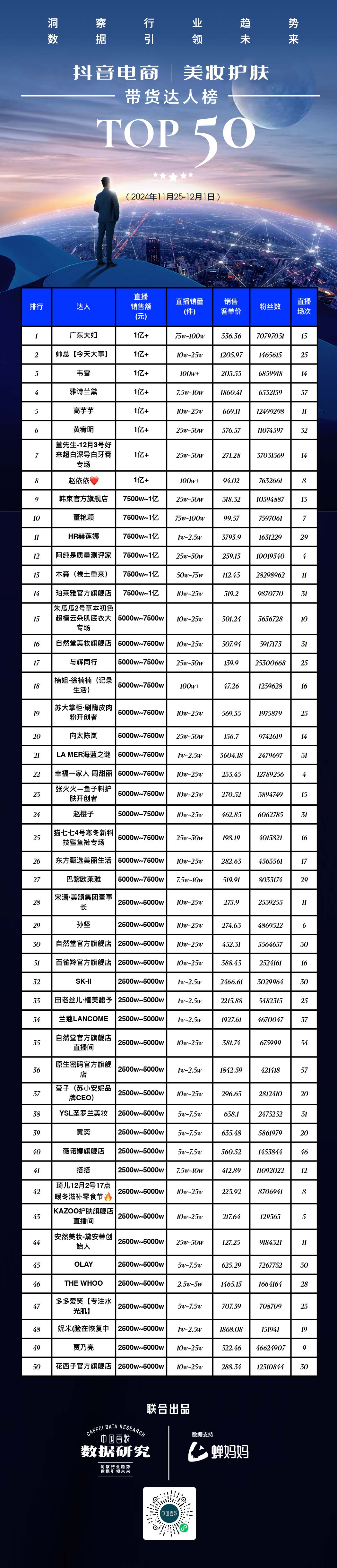 2024年11月25-12月1日|抖音电商美妆护肤带货达人榜TOP50