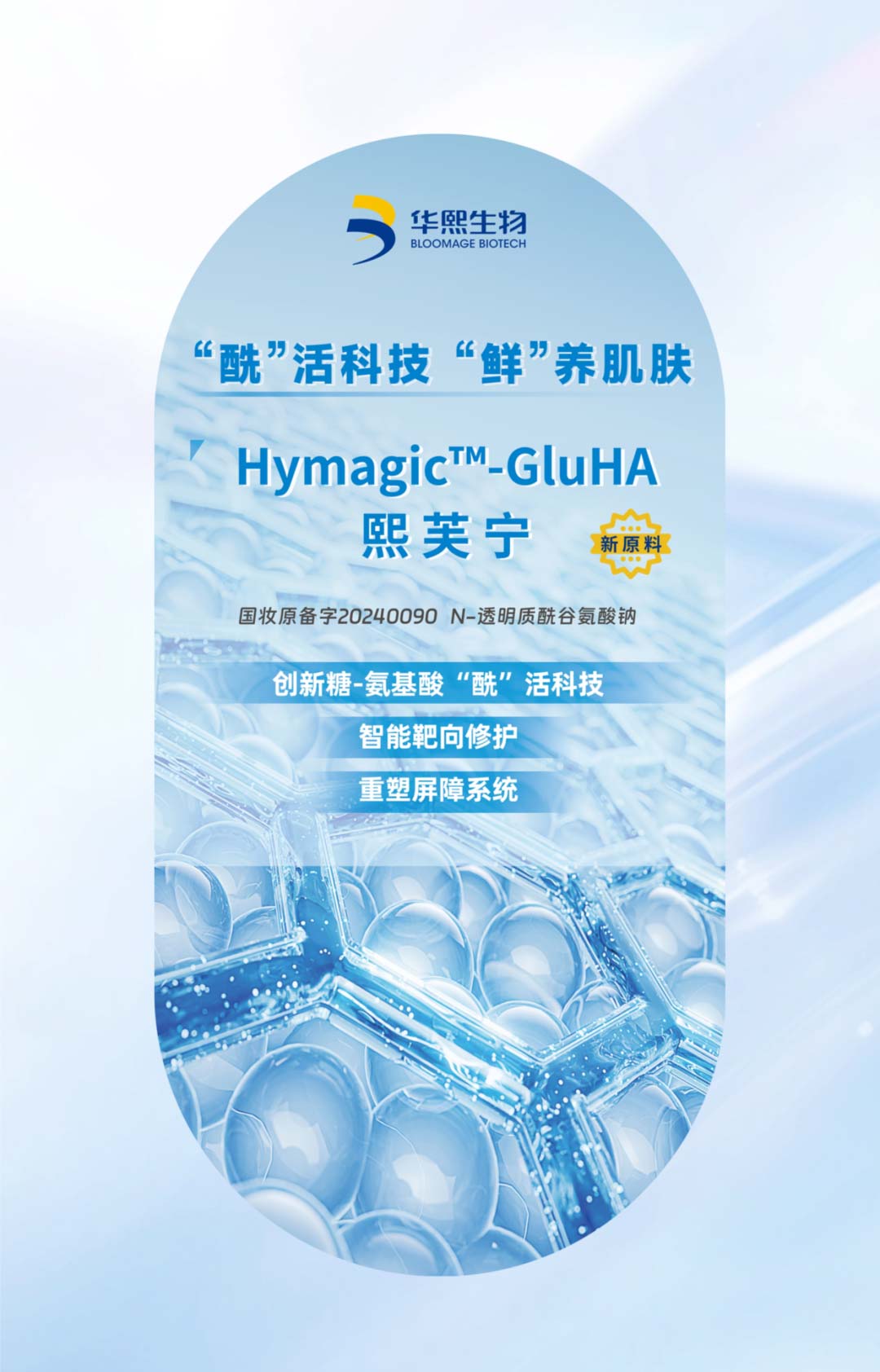 Hymagic™-GluHA 熙芙宁是华熙生物基于糖生物学开发的新型透明质酸原料,以 “酰活科技,鲜养肌肤” 为核心,通过创新糖-氨基酸偶联科技,完美融合透明质酸生物活力与谷氨酸屏障修护能量,具有智能靶向修护、免疫稳态调节、重塑屏障系统等多重功效。该原料已获国内新原料备案(国妆原备字20240090),为敏感肌及屏障受损肌肤提供了高效的修护方案,适配敏感肌、屏障受损肌等场景。