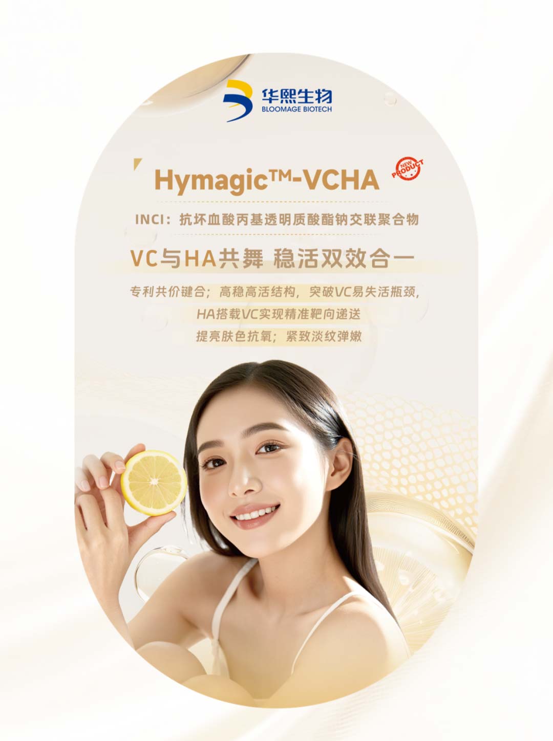 Hymagic™-VCHA通过创新性HybridLink™专利技术将维生素C(VC)与透明质酸共价结合,开创性实现“重塑ECM+赋弹水嫩”双核锁鲜,不仅提升了 VC 的稳定性,还兼具透明质酸深层锁水和 VC 抗氧提亮的功效,构筑了“水光充盈-立体紧致
