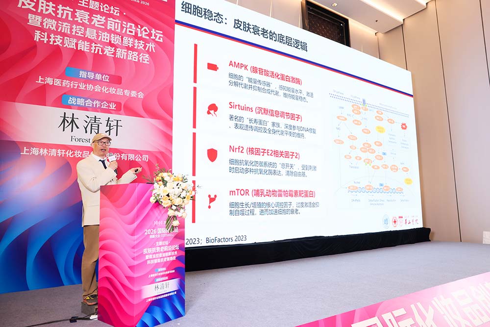 复旦大学附属华山医院皮肤科主任医师朱宁文教授聚焦皮肤衰老机制与抗衰技术创新,围绕细胞稳态等议题,分享了行业的前沿进展。他认为,细胞稳态失衡作为皮肤衰老的核心机制,正推动抗衰策略从“单一成分添加”转向“多通路协同干预”的复方模式。细胞稳态调控与内源抗衰,正在成为皮肤年轻化的科学新路径。