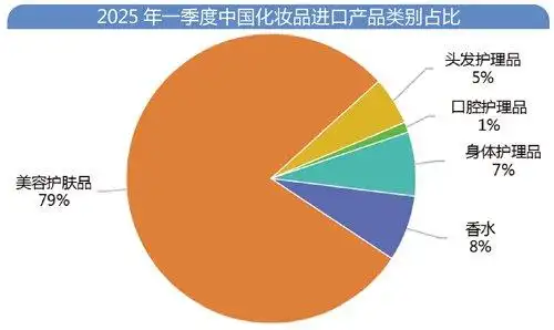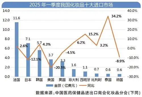 我国化妆品进口自2018年增速达到67%的高点之后增长持续放缓,2022年以来进入负增长。2025年一季度,进口额同比下跌3.1%,延续了缩减态势。一季度,我国化妆品进口来源地仍主要集中于欧美和日韩地区,排名前五位的国家分别是法国、日本、韩国、美国和英国,占据了进口总额的80.2%。
