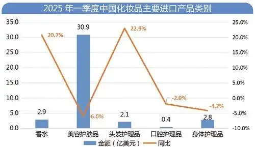 2025年4月16日,国家统计局发布社会消费品零售数据:首季度限额以上单位化妆品类消费品零售额1149亿元,同比增长3.2%,恢复了正增长态势。在进出口方面,中国医药保健品进出口商会统计数据显示,2025年首季度,我国化妆品类商品贸易进出口总额为56亿美元,与去年相比增长1.6%。其中,进口额为40.3亿美元,同比下跌3.1%,出口额为16.9亿美元,同比增长14.1%。