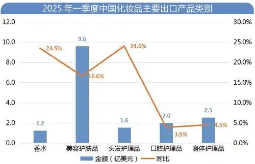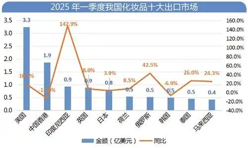 2025年首季度,我国化妆品出口不负众望,出口额达16.9亿美元,同比增长14.1%,出口前五大市场分别是美国、中国香港、印度尼西亚、英国和日本和韩国,占我国化妆品出口总额的45.9%。