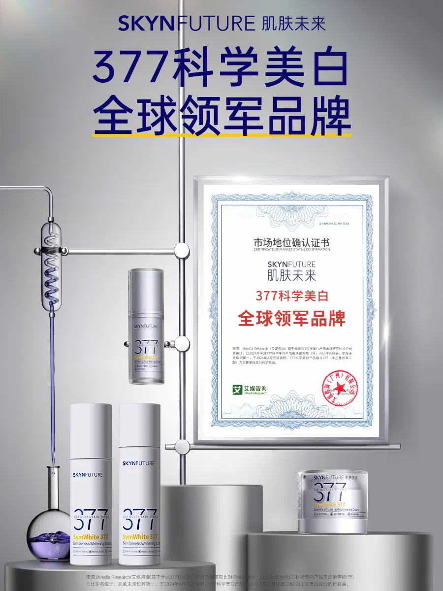 "既要路子够全,又要速度够快,还要效果够稳。"在美白科研这条高标准、多变量的赛道上,肌肤未来对用户需求的精准响应,彰显了品牌"始于377,超越377"的战略飞跃。据权威市场调查数据表明,以2022-2023年全球377科学美白产品市场销售额(元)占比排名统计,肌肤未来在国货377科学美白产品中连续两年全球销量第一,是当之无愧的377科学美白全球领军品牌。更在2022-2024年连续三年荣膺国货377科学美白产品全国销量第一,真正做到了以中国品牌定义世界成分。
