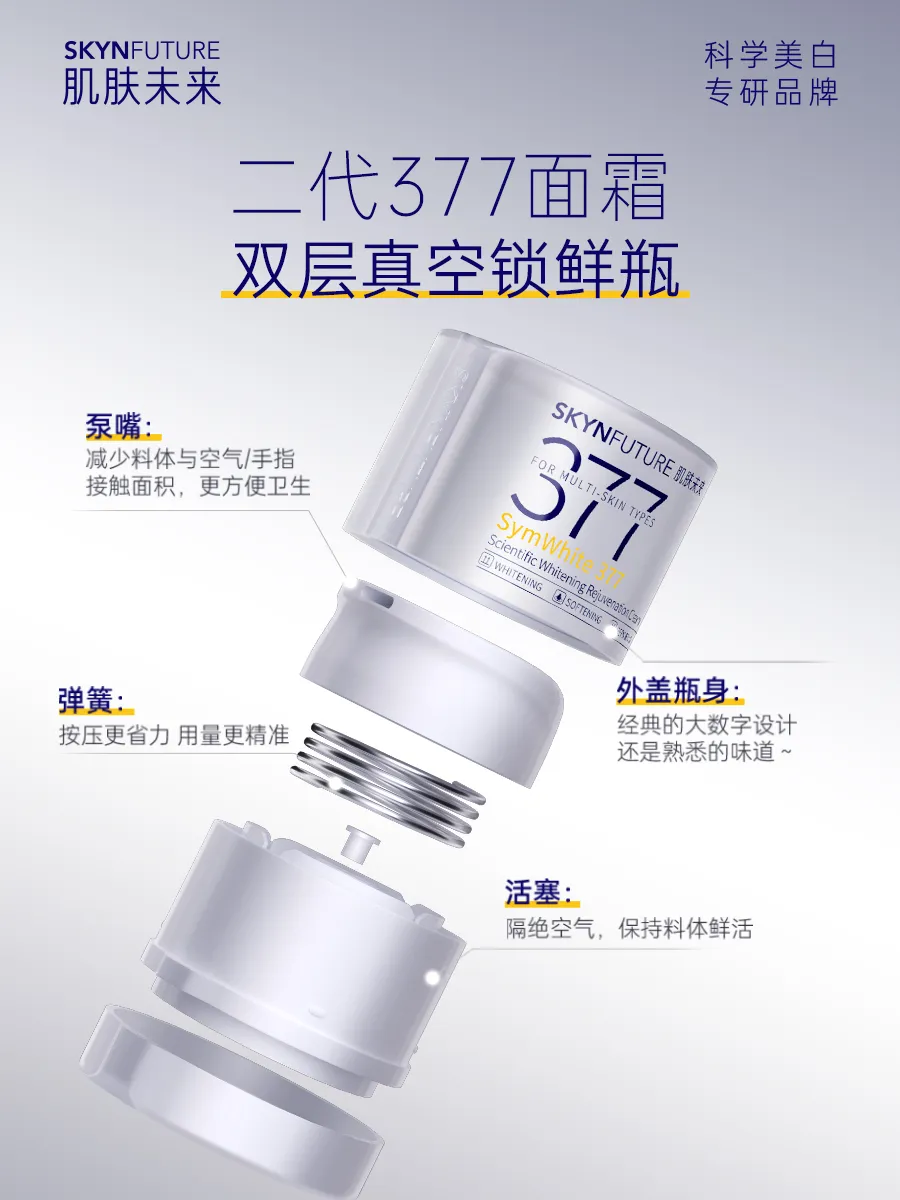 2023年起,肌肤未来在「五率一度」美白组学的指导下逐步推出二代377升级系列产品,再次刷新了377美白科技的应用上限,系列产品被行业誉为"六边形战士"。经过大量消费者调研及回访,肌肤未来二代377系列完成了“由内而外”的升级:内部的产品配方搭载全新创研的独家专利二代377,兼具高效与温和,多通路协同,让用户白得更快、更稳、更安全;同时外部的包装语言上也实现了全新升级,以未来科技的至高载体“太空舱”为核心灵感,凝练为握于掌心的“美白舱”。侧面流畅线条感轨道,仿佛美白剂输送通路,直达肌底瓦解黑色素;顶部俯视犹如锁芯,封存核心专利技术,轻启瓶盖打开通往白皙肌肤任意门;纯净配色语言与醒目数字代码,直观传达产品信息的同时,展现凝练简洁的未来感美学。作为“二代377系列”的明星产品,二代377面霜更是在由中国香料香精化妆品工业协会主办的2025中国化妆品科学技术大会科技成果盛典上荣获“新”包装殊荣。