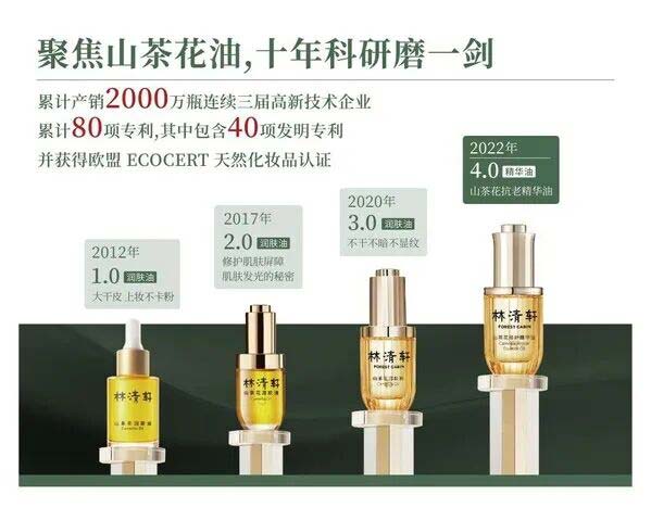 2014年,是林清轩发展史上最关键的一年,该品牌推出的核心大单品山茶花精华油,源于孙来春在福建山区的一次偶然发现,一位70多岁客家老妇人用山茶花油护肤,肌肤状态极佳。孙来春敏锐地捕捉到了这个机会,立刻带领科研团队提取山茶花原料,经过反复研发,最终推出了第一款山茶花精华油,正是这款产品后来成为了林清轩爆款产品,也成为了该企业盈利的现金奶牛,从此开启了“以油养肤”的国货新篇章,也让林清轩真正走进了大众视野。据数据统计,截至2025年,连续11年全国零售额第一,累计销量超4500万瓶,2025年上半年营收占比达45.5%,毛利率86.2%,远超多数国际高端单品。