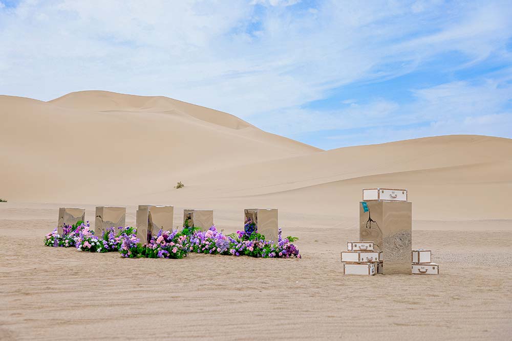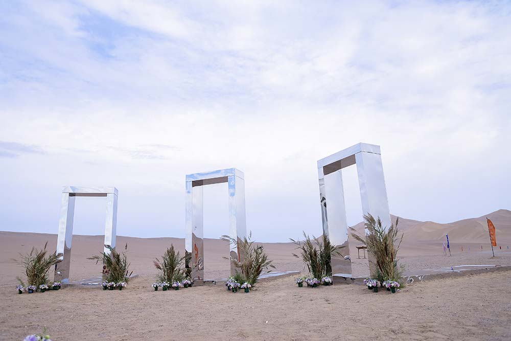 26日暮色降临,嘉宾们置身沙漠,以“丝绸之路”为灵感,踏上一条融合叙事与体验的探索之路:于“立心印”领取通关文牒;于“纳吉言”抽取福气签;于“择前路”投壶选途;于“添锦色”披风加身——最终,收集齐一枚枚印记后,每位嘉宾获得定制琵琶胸针,步入主会场,也象征完成一场从身体至心灵的修护之旅。抵达终点后,嘉宾可品尝特色糕点、体验越野摩托及骆驼骑行,领略沙海带来的非凡感受。
