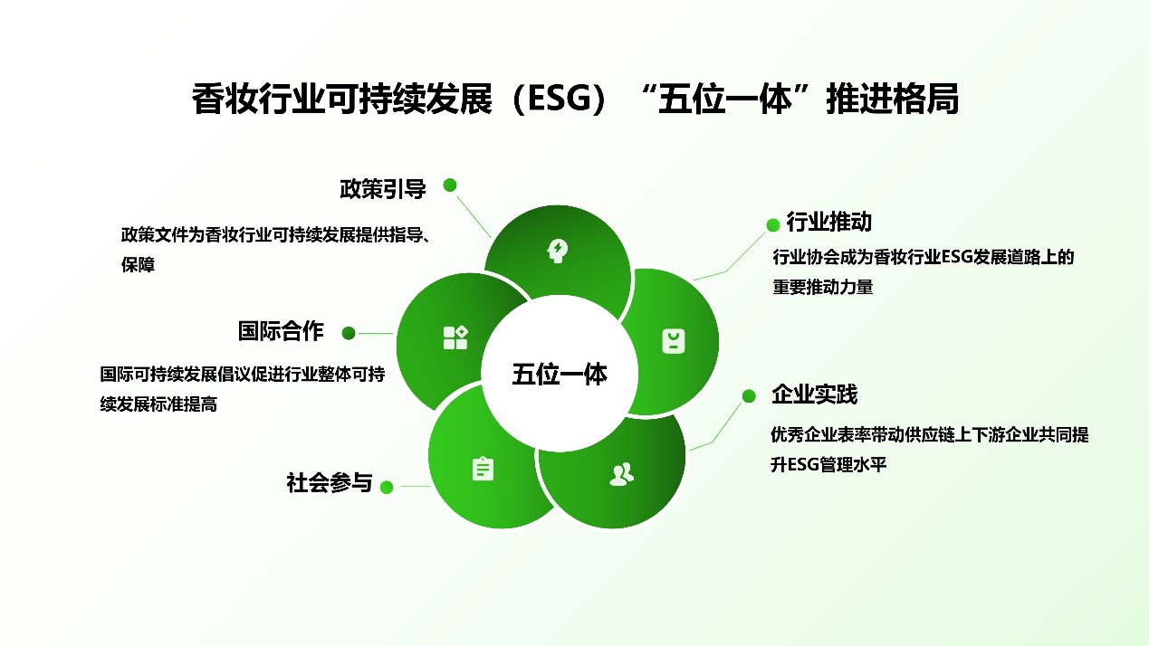 颜江瑛博士说,总的来说,如今已经形成了香妆行业可持续发展(ESG)“五位一体”推进格局,包括政策引导、行业推动、国际合作、企业实践、社会参与等。