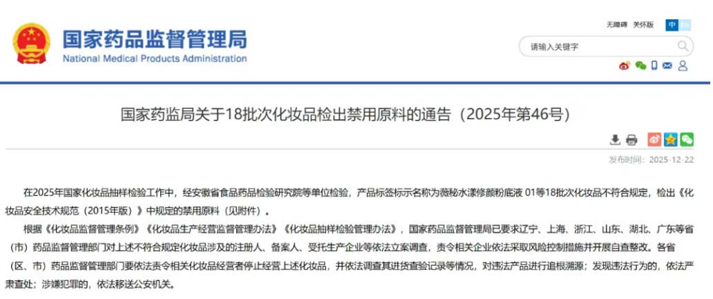 12月22日,国家药监局网站发布(2025年第46号)通告,事关18批次化妆品检出禁用原料。通告内容显示,在2025年国家化妆品抽样检验工作中,经安徽省食品药品检验研究院等单位检验,产品标签标示名称为薇秘水漾修颜粉底液 01等18批次化妆品不符合规定。