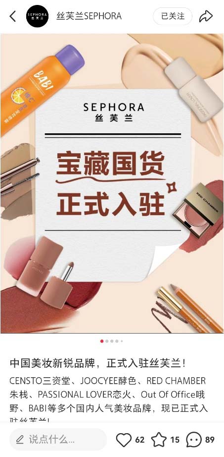 高端美妆零售渠道丝芙兰近期官宣引入酵色、BABI等6个国货彩妆品牌。这被认为是其在面临业绩压力下,向流量与性价比策略的转变。此举引发消费者关于其是否“降低格调”的讨论。对入驻的国货品牌而言,这是一次获得高端渠道背书、提升品牌形象的机会。