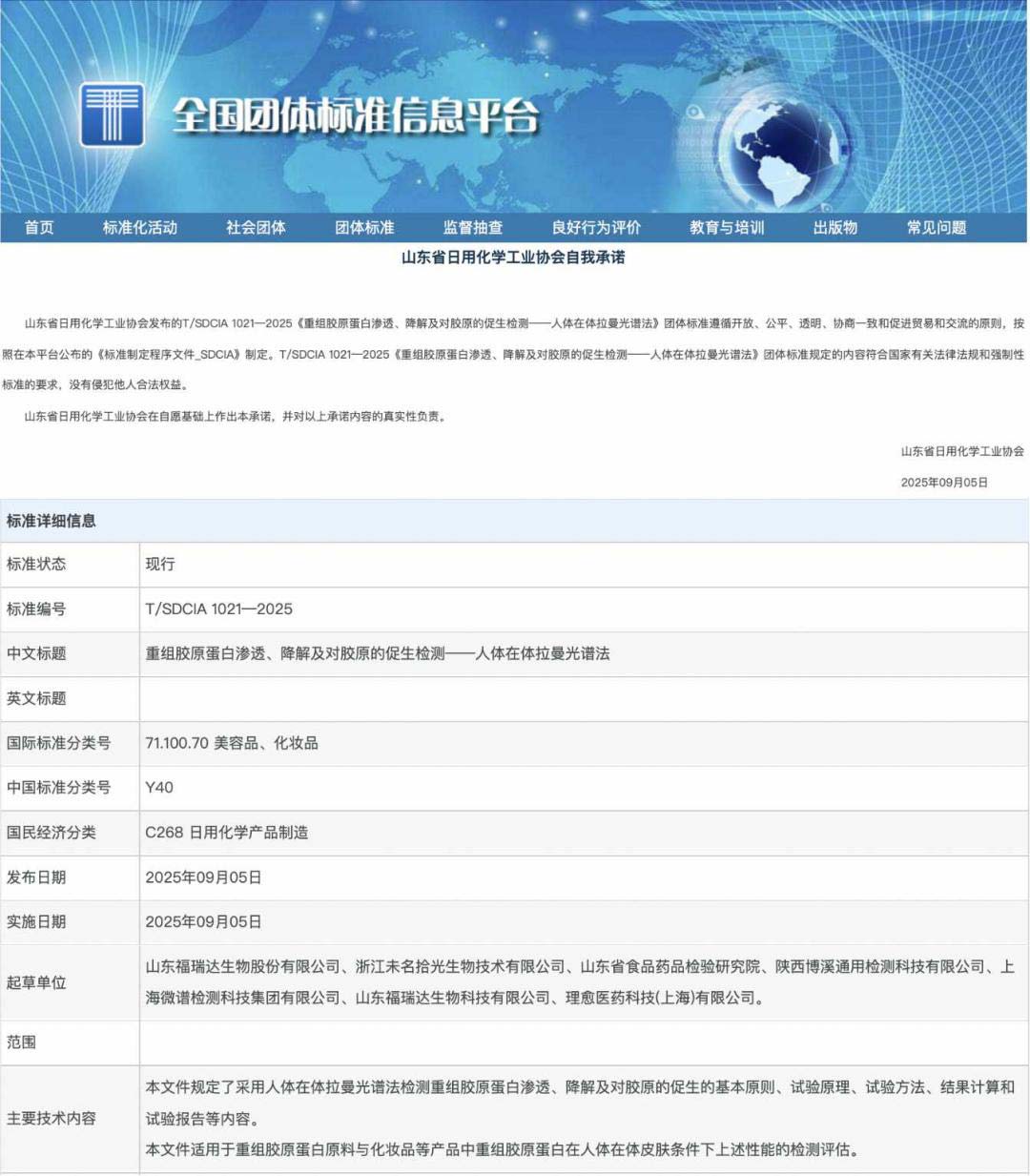 近日,由山东省日化行业协会归口组织、山东福瑞达生物股份有限公司牵头起草的《重组胶原蛋白渗透、降解及对胶原的促生检测——人体在体拉曼光谱法》团体标准正式发布实施,标志着重组胶原蛋白皮肤渗透检测有了新标准。