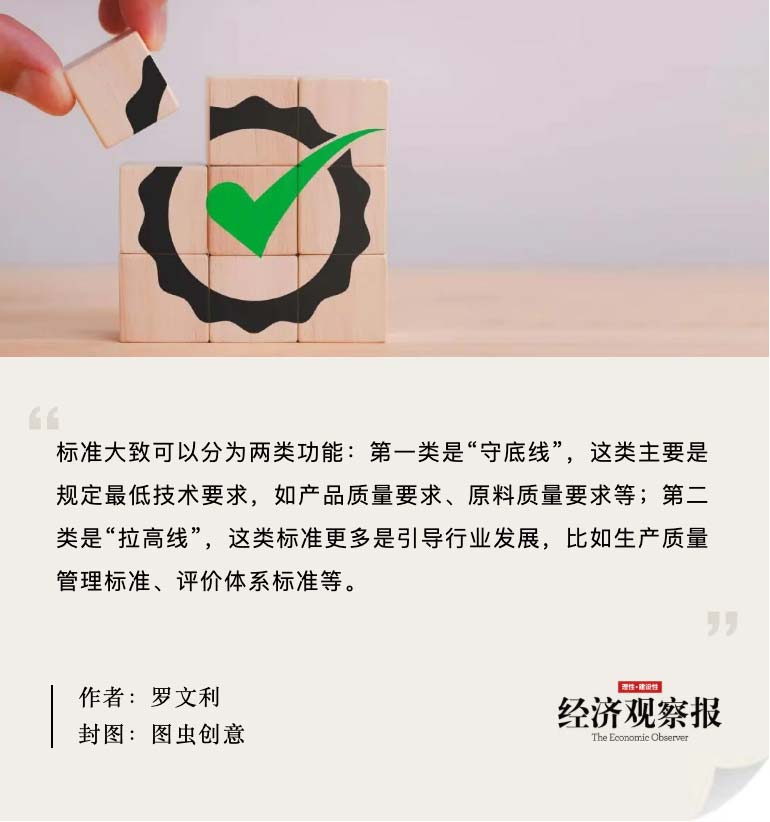 标准大致可以分为两类功能:第一类是“守底线”的标准,这类主要是规定最低技术要求。例如产品质量要求、原料质量要求等,如果达不到这些要求,产品就不能进入市场;第二类是“拉高线”的标准,这类标准更多是引导行业发展,比如生产质量管理标准、评价体系标准等。“拉高线”标准不一定是强制性的,但可以给企业一个发展方向,让大家知道什么是更高的技术水平。