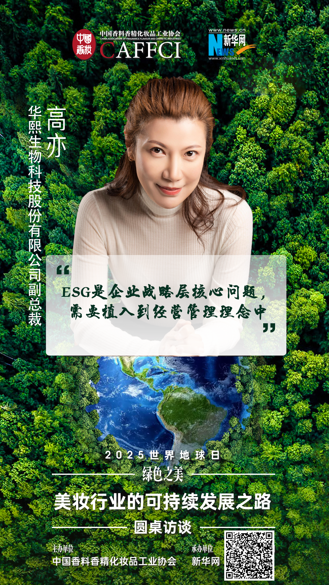 在2025世界地球日到来之际,由中国香料香精化妆品工业协会主办、新华网承办的“2025世界地球日——绿色之美:美妆行业的可持续发展之路圆桌访谈”在北京举行。华熙生物科技股份有限公司副总裁高亦,从ESG与企业发展关系,企业可持续实践案例,以及美妆行业在可持续发展面临的机遇和挑战等内容,进行了深度交流。