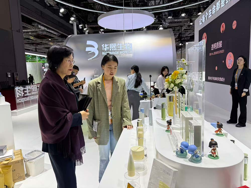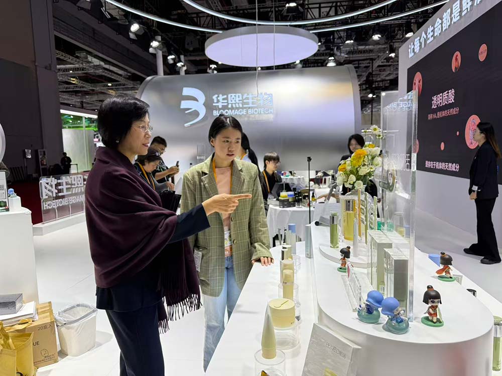 11月7日,中国香料香精化妆品工业协会理事长、医学博士颜江瑛,顾问董树芬参访第八届进博会华熙生物展台,对华熙生物始终致力于科技创新和生物制造技术以及相关成果转化与产业升级给予了高度评价。