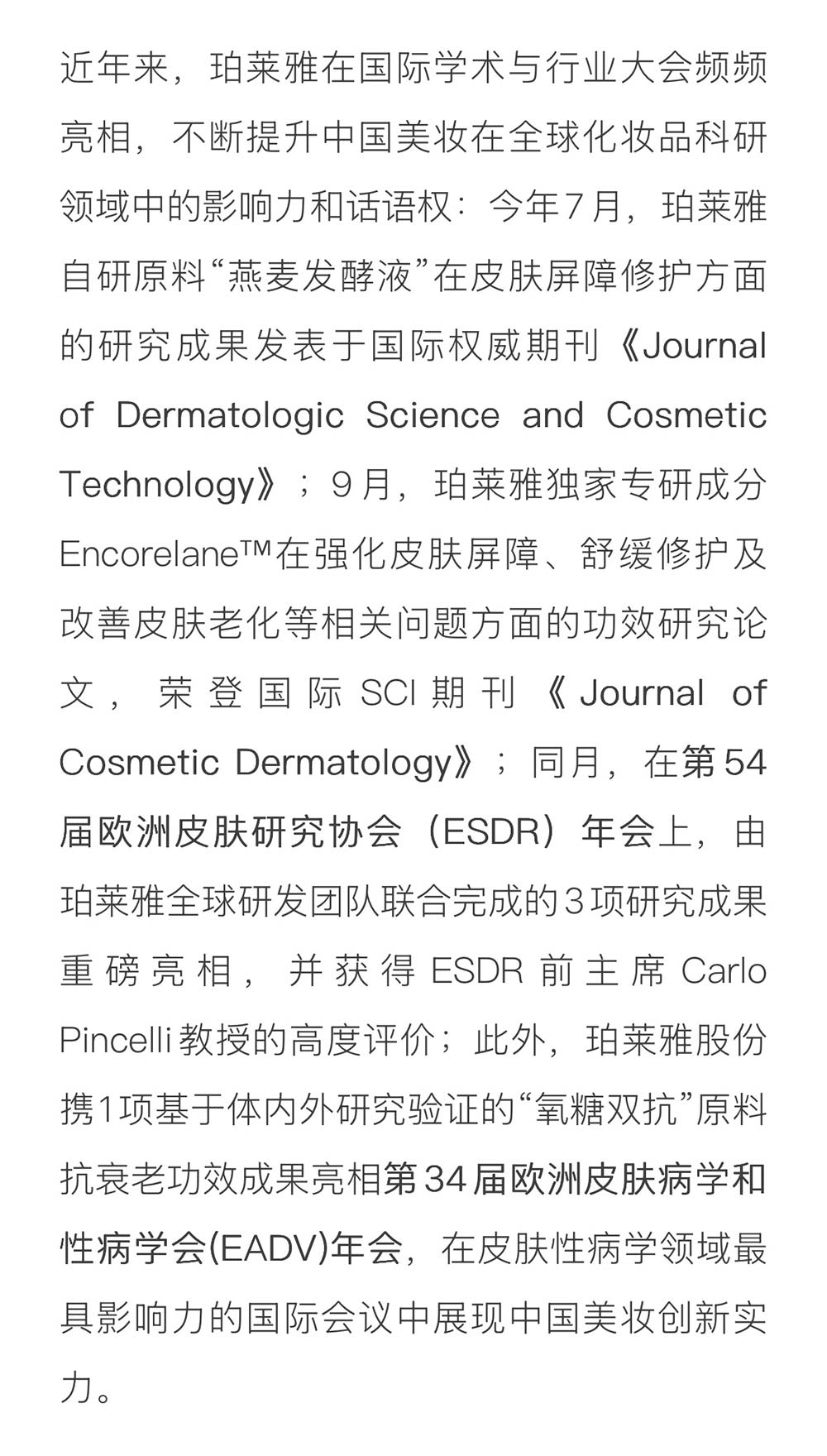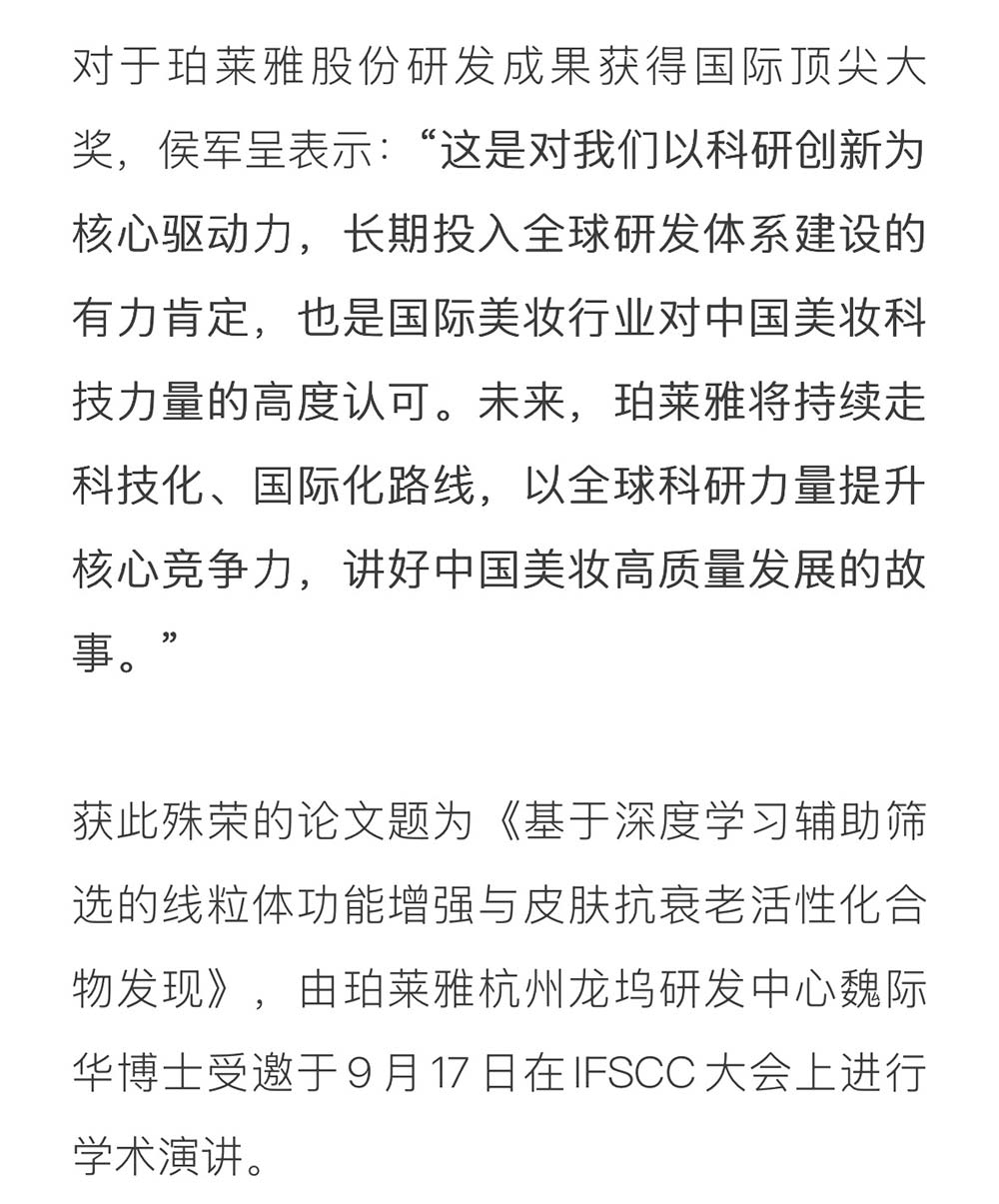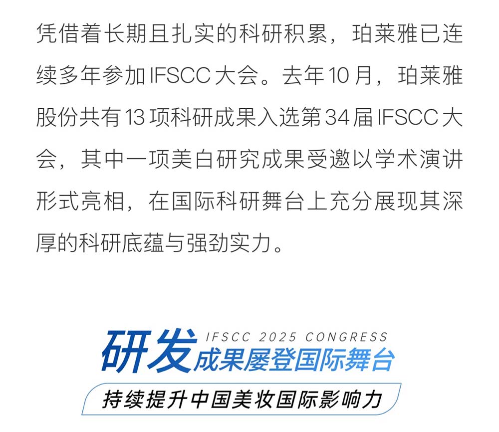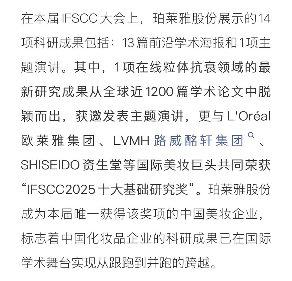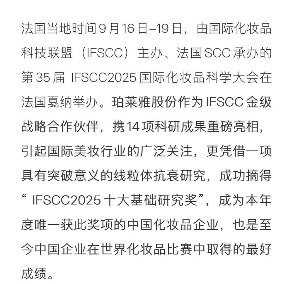 国货美妆唯一!珀莱雅股份斩获「 IFSCC2025十大基础研究奖」