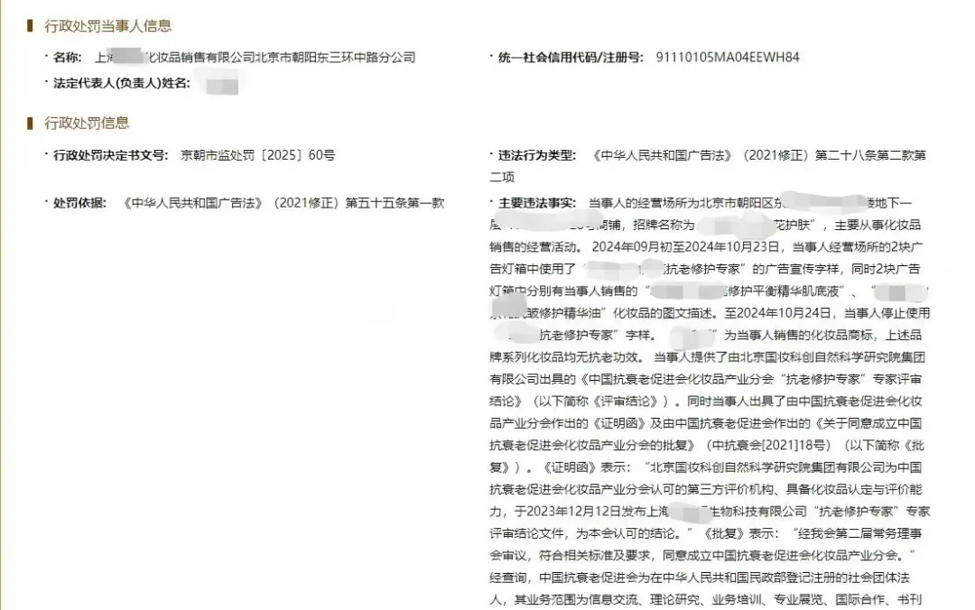 据北京朝阳区市监局发布的行政处罚信息显示,位于北京市朝阳区的某知名美妆品牌店铺,于2024年9月至10月23日期间,在门店内的2块广告灯箱中使用了“某某抗老修护专家”的广告宣传字样,同时2块广告灯箱中还分别有该店铺中所销售的“XX修护平衡精华肌底液”和“XX抗皱修护精华油2款产品”的图文描述。